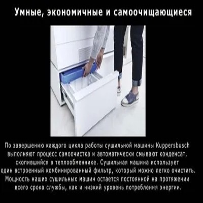 Сушильная машина Kuppersbusch T 40.0 G Solid GoldПрограммы/дополнительные программы: Автоматические программы для хлопка и немнущихся тканейОт степени сушки «под утюг» до «экстра-сухое»Специальные программы Сушка в корзине, Удаление пыльцы, Смешанное, и другие программы: Рубашки, Джинсы, Синтетика, Шерсть, Спортивная одежда, Пух/ подушки, Махровые полотенца, Пропитка, Шелк, Освежить (10-90 минут), Отсрочка старта (10-150 минут)Избранное Сохраняет до 6 Ваших любимых программДополнительные функции Антибактериальная обработка, Бережный уход +, Сушка +, Отсрочка старта, Экспресс8 кг белья будут полностью высушены за 96 минут («в шкаф»)Преимущества:Большой цветной дисплей 4,3’’Корзина для сушки деликатных тканей и спортивной обувиСушильная машина конденсационного типа с технологией Heat Pump и система самоочистки Autoclean для эффективного использования электроэнергии на протяжении всего срока службы машиныВысший уровень эффективности конденсацииПрограмма антибактериальной обработки для гигиенической сушки бельяПрограмма «Удаление пыльцы» позволяет очистить ткани от пыльцыПревосходная шумоизоляция, макс. 61 дБ(А)Светодиодная подсветка барабанаЗащита от складокЭлектронная система измерения остаточной влажности бельяИндикация хода программы и времени до окончания программы, отложенный запуск – до 7 днейРегулируемый по интенсивности акустический сигнал окончания программыУгол открывания люка – 180°, диаметр люка – 36/31 смВозможность перенавески люка (правая/левая)Защита от детейКонтроль температурыСпециальные программыСушка в корзинеВлажные вещи из шерсти желательно как можно меньше подвергать воздействию, так как они имеют тенденцию сморщиваться и садиться. Спортивная обувь может повредить барабан из-за своего веса. Использование корзины позволяет выполнять деликатную сушку без перемещения отдельных стойких к машинной стирке предметов: шерстяные изделия, спортивную обувь из синтетических материалов или искусственной кожи, шапки, велосипедные шлемы, мягкие игрушки, игрушки и пр.СмешанноеЭта программа оптимально подходит для сушки смешанной партии белья из хлопка и синтетикиДругие программыИспользуйте эти программы для оптимальной сушки различных видов текстиля, например сорочек, блузок, джинсов, шерсти и пр.Дополнительные программыАнтибактериальная обработкаПри выборе этой программы увеличивается время дополнительной сушки, что позволяет уничтожать большинство бактерийБережный уход плюсДля бережной сушки деликатных вещей. Температура сушки пониженаОтсрочка стартаС помощью данной программы запуск программы можно отложить на более позднее время в соответствии со своим привычным образом жизни (например, для использования льготного ночного тарифа на электроэнергию)Сушка +При выборе этой программы временно увеличивается степень сушки — на время работы выбранной программыВремяПри открытии программы с управлением по времени отображается минимальное время выполнения программыЭкспрессДля быстрой сушки небольшой партии или отдельных изделий из хлопка, синтетики или смешанной тканиХарактеристики:Конденсационная сушильная машина с технологией Heat PumpЗагрузка 1-8 кгСтационарная установка/установка в колоннуНавеска люка левая/праваяВозможность изменения навески люкаРазмеры прибора (Ш х В х Г): 595 х 850 х 640 ммСделано в Шве