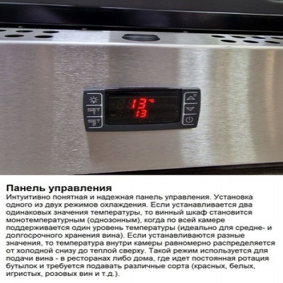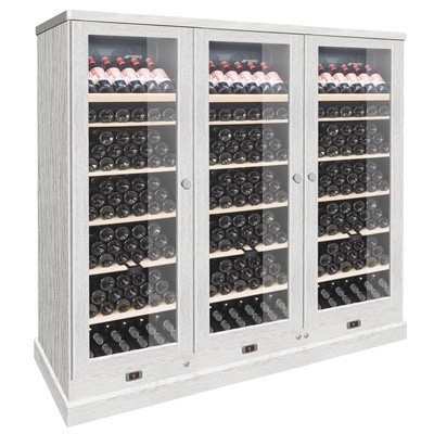 Отделка - натуральный дуб, цвет белый.2 режима использования настроек температуры в каждой камере:- мультитемпературный режим: в нижней части камеры задается низкая температура (например, +5°C), в верхней части камеры задается высокая температура (например, +18°C); таким образом, в нижней части храним игристые, в средней части - белые, а в верхней части - красные вина; данный способ подходит для подачи вина- однозонный режим: в нижней и верхней части камеры задаем один температурный режим (как правило, +12°C); данный режим идеален для долгосрочного хранения любого вина и их правильного вызревания, будь то игристые, белые, красные или розовые винаМаксимальная закладка 594 бутылки.Компрессоры Embraco премиум класса - долговечные и самые надежные.Стеклянные двери в деревянной раме.Винтажные ручки из дерева.Интегрированные в цоколь замки: защита коллекции вина.18 усиленных деревянных полок из дуба для бордосских и бургундских бутылок, три из них наклонные.Цифровые панели управления с дисплеями в цоколе прибора.Белая внутренняя подсветка - длинная лампа для качественной подсветки и без нагрева: два режима работы (постоянный свет, свет при открытии дверцы).Звуковой и визуальный индикатор изменения температуры внутри камеры.Двойной стеклопакет в дверцах с закаленными стеклами с защитой от ультрафиолетового излучения.Угольные фильтры для естественного проветривания.Угол открытия дверей: 100°.Хладагент R600a.Длина шнуров электропитания: 3х2,2 м.Вес нетто/брутто: 306/316 кг.